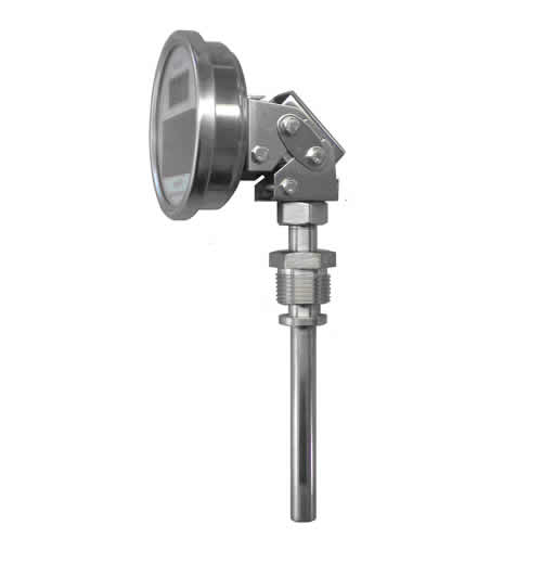 万向型双金属温度计是工业用双金属温度计主要的元件是一个用两种或多种金属片叠压在一起组成的多层金属片。能自动连续记录变化的仪器,为提高测温灵敏度,通常将金属片制成螺旋卷形状。当多层金属片的温度改变时,各层金属膨胀或收缩量不等,使得螺旋卷卷起或松开。由于螺旋卷的一端固定而另一端和一可以自由转动的指针相连,两种金属在温度变化时体变化量不一样,因此会发生弯曲。将其一端固定,另一端随温度变化而发生位移,位移量与气温接近线性关系。自记系统由自记钟,自记笔组成,自记笔与放大杠杆相连并受感应元件操纵因此,当双金属片感受到温度变化时,指针即可在一圆形分度标尺上指示出温度来。这种仪表的测温范围是200~650℃,允许均为标尺两程的1%左右。